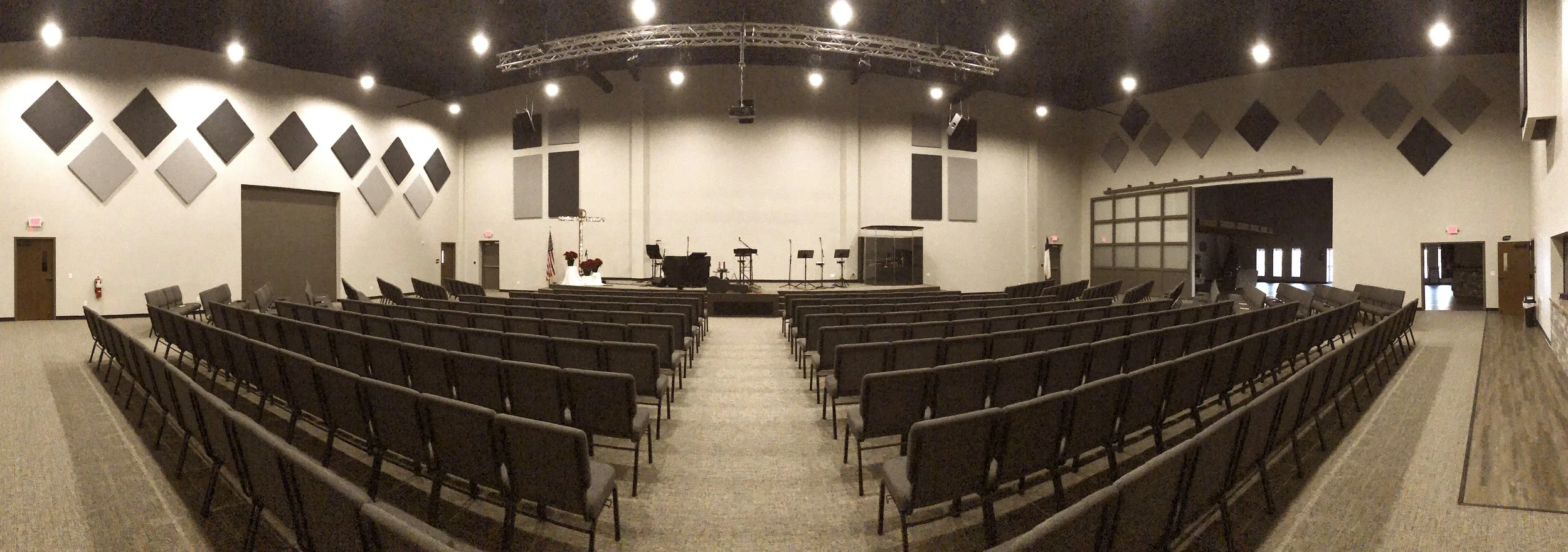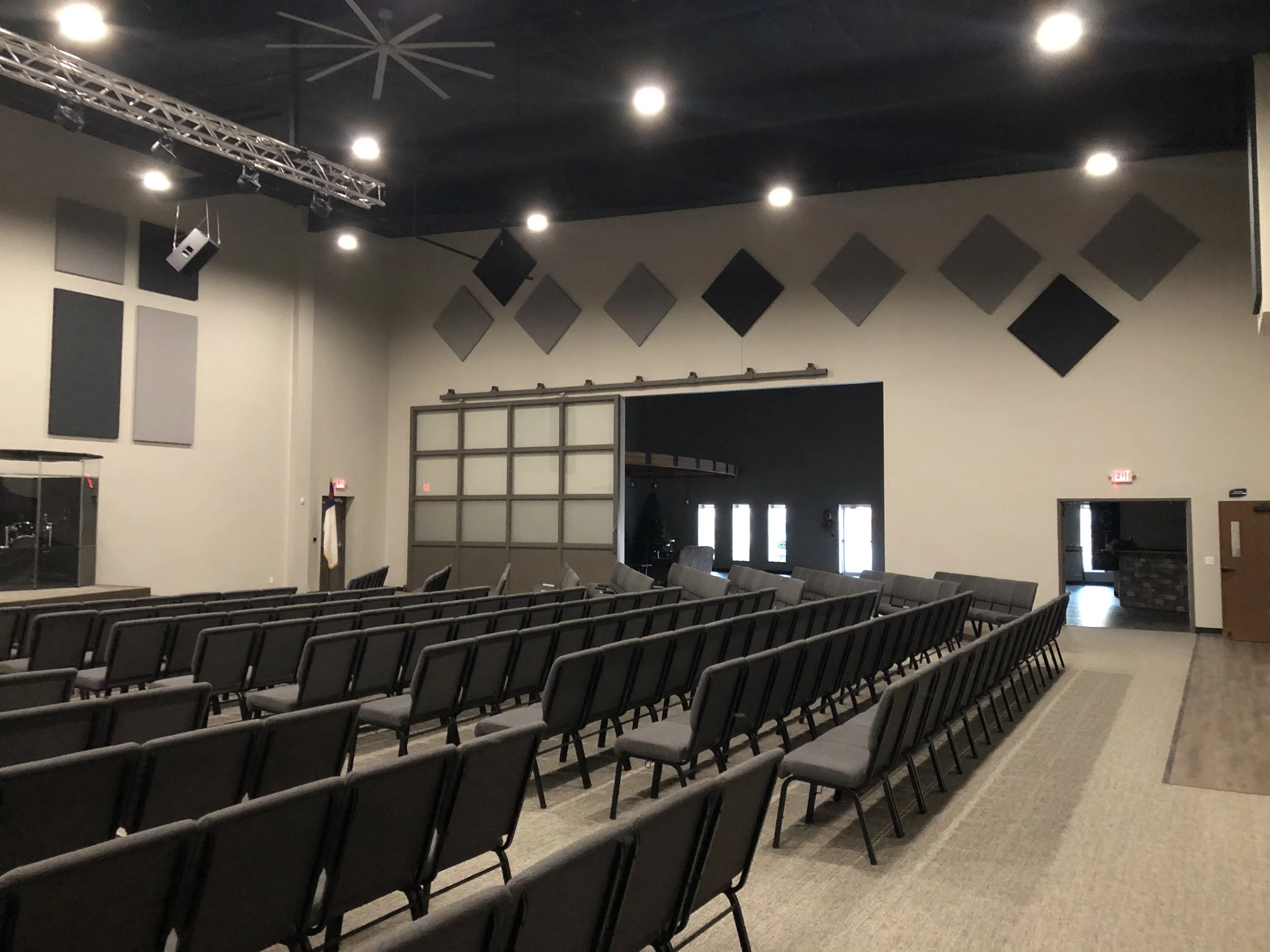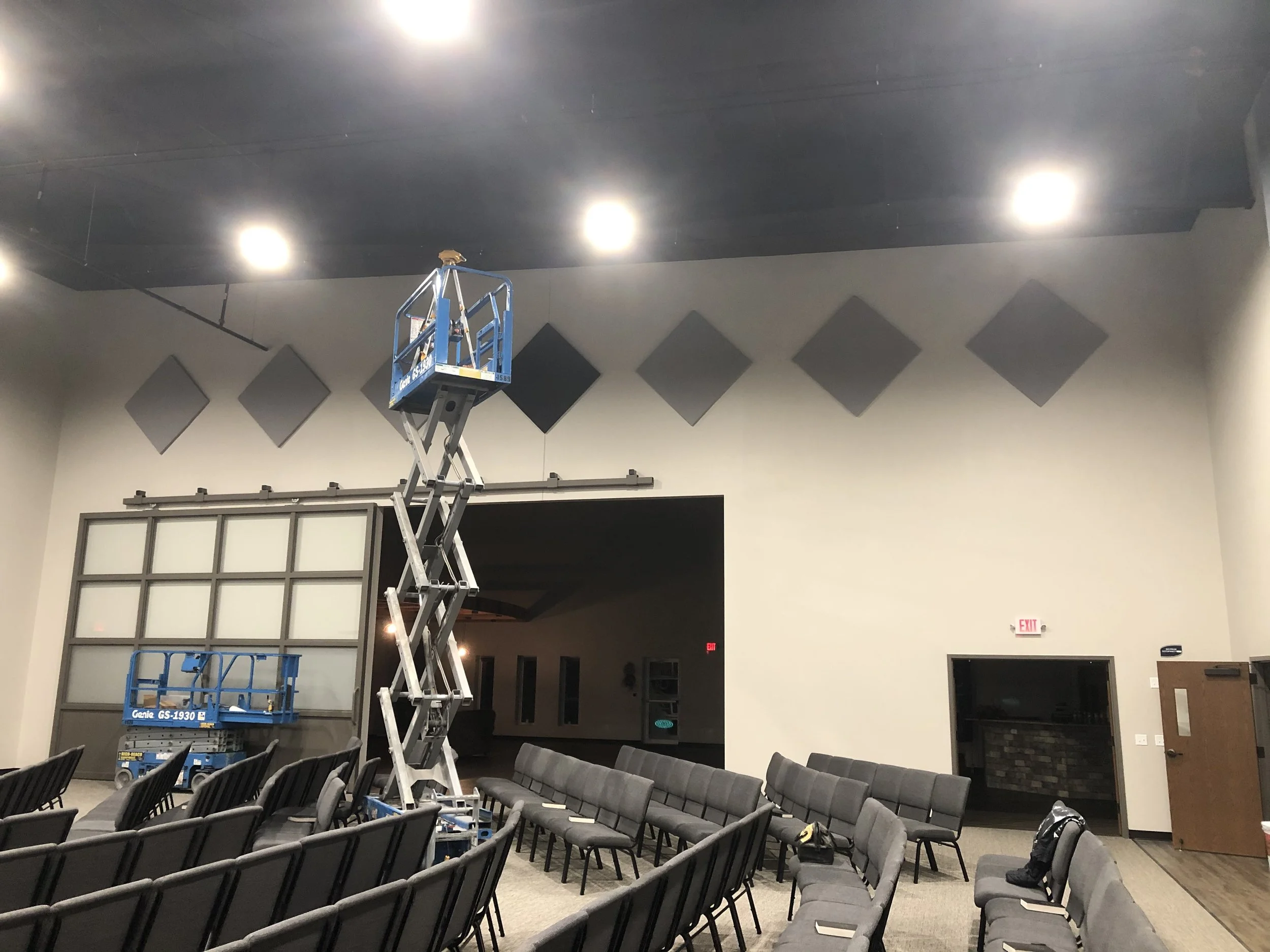 Cost was a factor when designing the building so they went with a simple rectangle room with high walls which also meant lots of echos. We came alongside the church to build the acoustic panels with help from church members. This saved over $8,000 just in panels that would’ve otherwise had to be purchased. The panels greatly reduced the echo’s in the room and upgraded the look in the process!